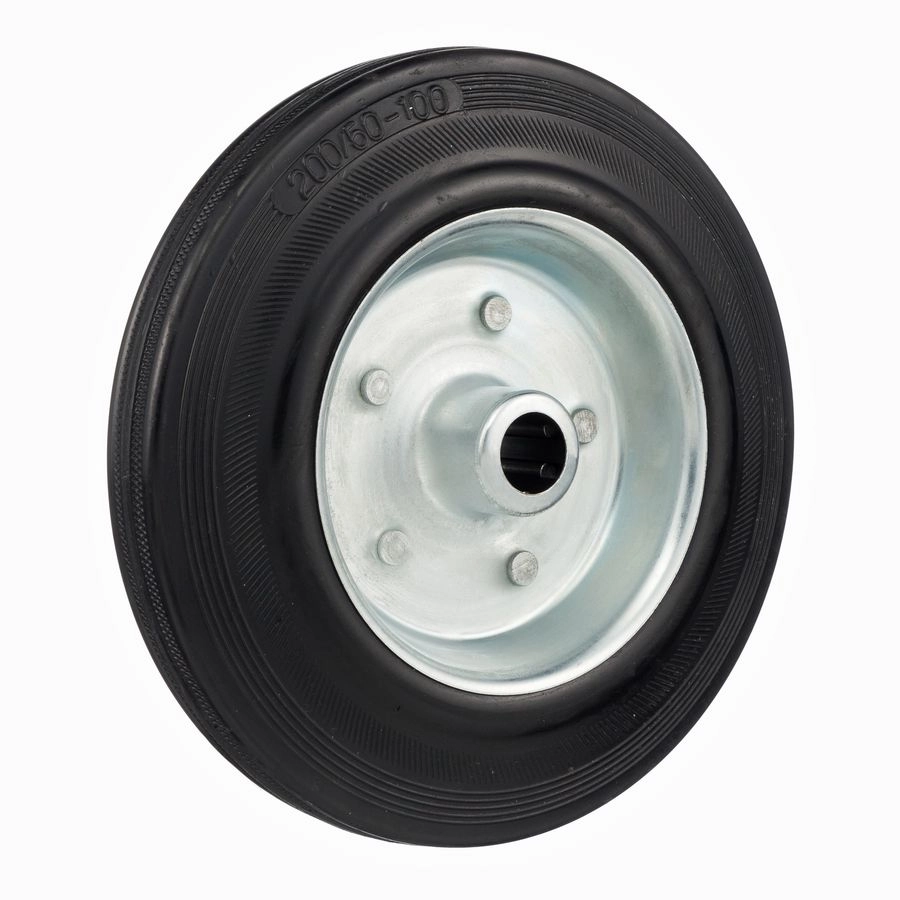 Колесо под ось 20мм. 4000-200, диаметр 200мм., грузоподъемность 185кг., резина, металл. Колесо из черной литой резины. Центр из стального оцинкованного обода из штампованной стали. В оси колес роликовый подшипник. Колеса из черной резины, центр из двух гальванизированных дисков из штампованной стали. Роликовый (игольчатый) подшипник расположен в углублении, выдавленном под прессом, и содержит цилиндрические ролики подшипника. Возможно применение на относительно грубых полах складов, заводов, производственных и строительных площадках. Данные колеса можно использовать на неровных поверхностях, во влажной окружающей среде и использовании вне помещения, не рекомендуется применять в среде с органическими растворителями, хлорированными веществами, гидрокарбонатами и минеральными маслами. Температура эксплуатации от -20 до +70С.