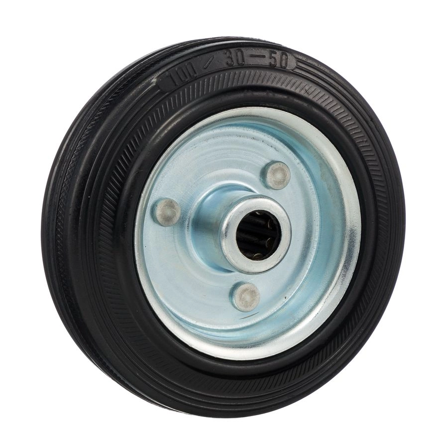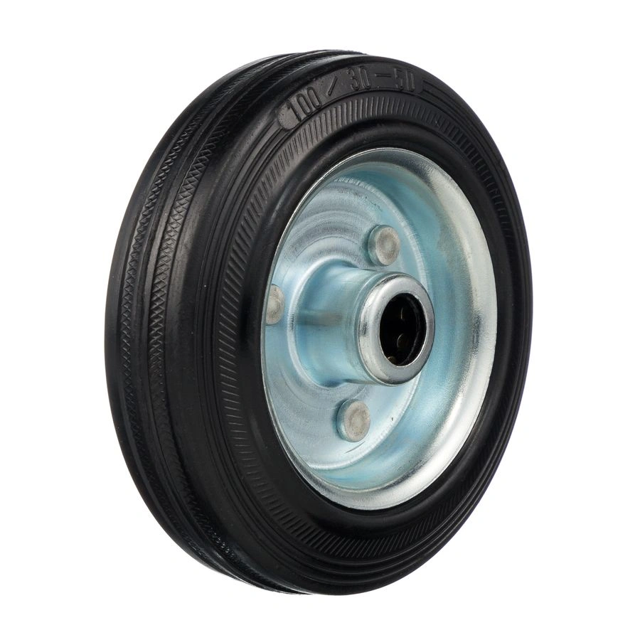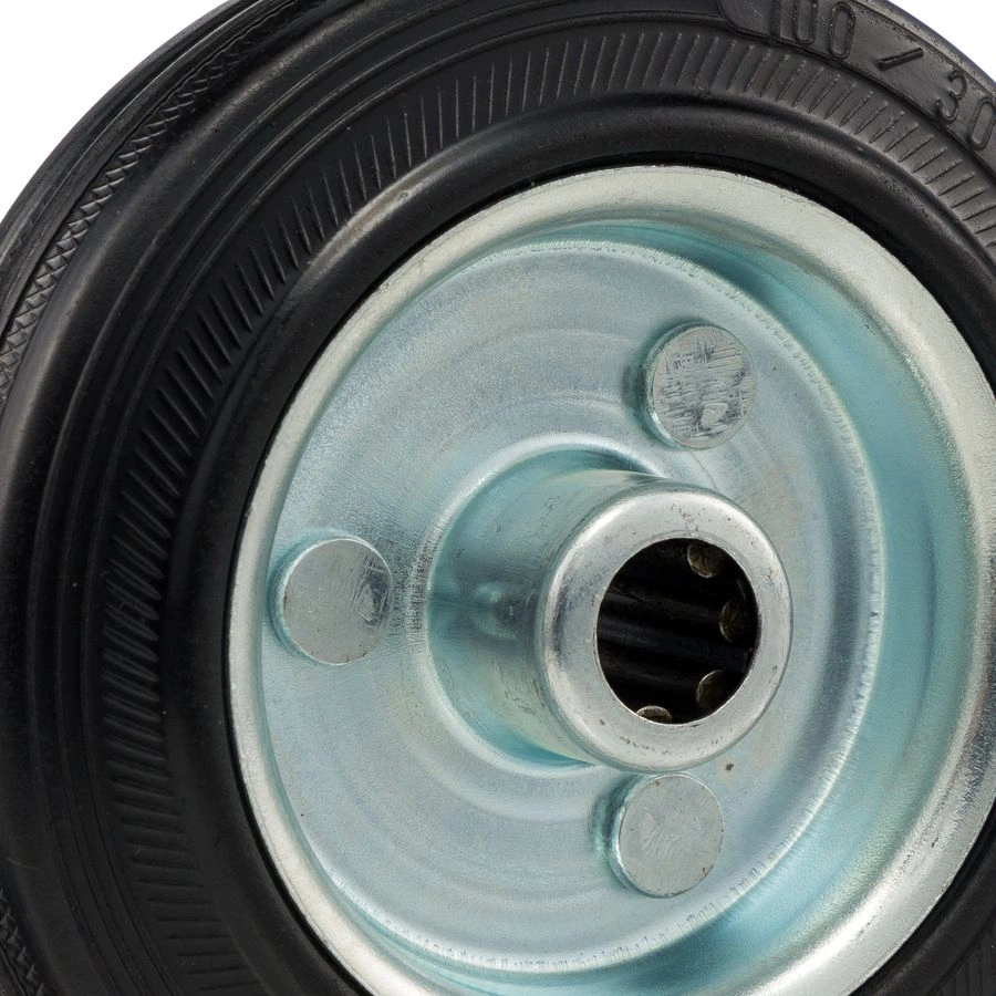 Колесо 4000-100 диаметром 100мм. под ось 12мм. Колесо из черной литой резины. Центр из стального оцинкованного обода из штампованной стали. В оси колес роликовый подшипник. Колеса из черной резины, центр из двух гальванизированных дисков из штампованной стали. Роликовый (игольчатый) подшипник расположен в углублении, выдавленном под прессом, и содержит цилиндрические ролики подшипника. Возможно применение на относительно грубых полах складов, заводов, производственных и строительных площадках. Данные колеса можно использовать на неровных поверхностях, во влажной окружающей среде и использовании вне помещения, не рекомендуется применять в среде с органическими растворителями, хлорированными веществами, гидрокарбонатами и минеральными маслами. Температура эксплуатации от -20 до +70С.
