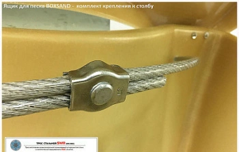 - Устойчивость к коррозии благодаря ПВХ-оплётке троса и оцинкованному зажиму