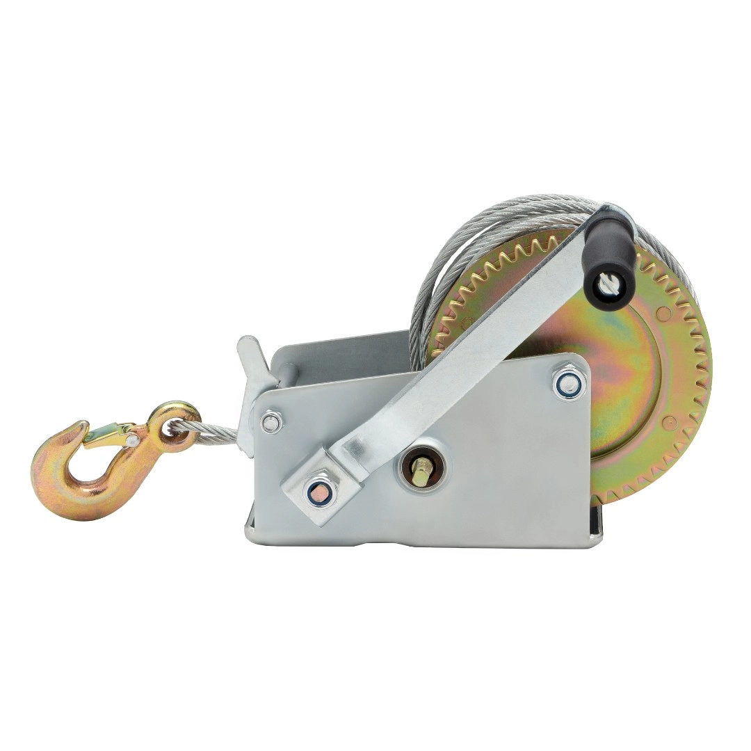 Барабанная ручная лебедка модели WH25-20 обеспечивает тяговое усилие до 1,1т., при длине троса 20м., диаметр троса 5,6мм. Ее применяют для разгрузки товаров в магазинах и на складах, в строительстве, на производстве и в быту. Стальной трос снабжен крюком с защелкой. Перемещение груза осуществляется за счет вращения ручки с пластиковой рукояткой. При отпущенной ручке автоматически срабатывает тормоз, что позволяет зафиксировать груз. Направление хода вперёд-назад. Тип передачи шестеренчатая (1 скорость). Габариты 250х160х180мм., вес 8,5кг.