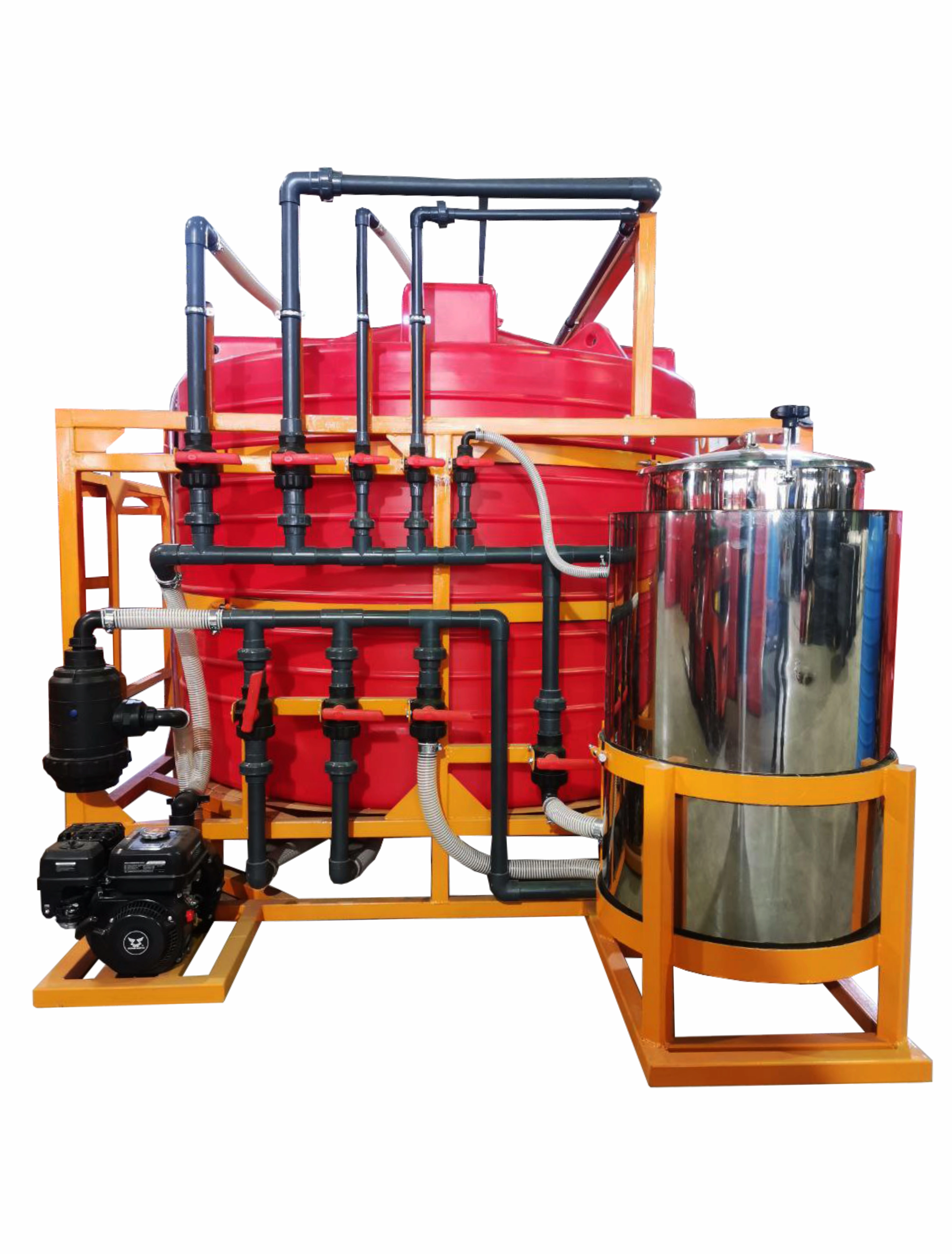 Узел оснащён бензиновой мотопомпой высокой производительности, подходящей для перекачки жидких минеральных удобрений (КАС, ЖКУ, аммиачная вода) и СЗР. Она обеспечивает как заполнение ёмкостей, так и эффективное перемешивание или слив.