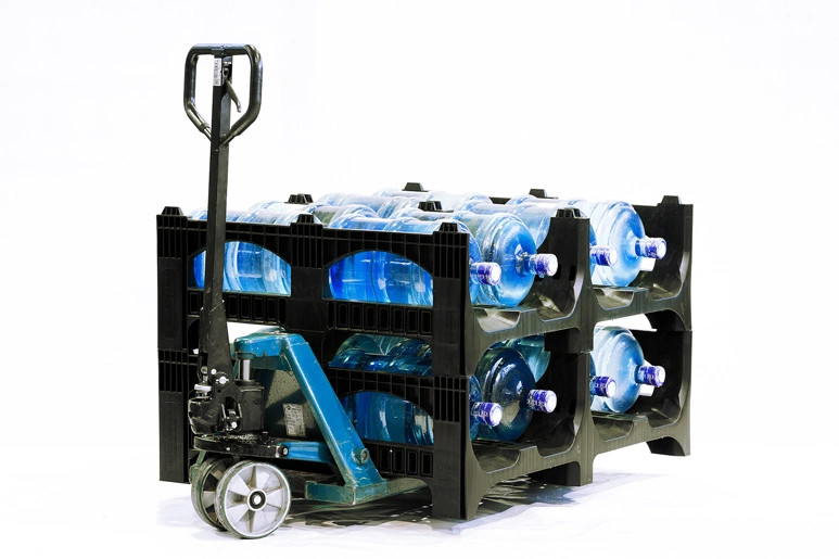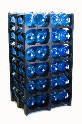 Cовременное решение для производства, транспортировки, хранения и дистрибуции 19-и литровой бутилированной воды. Конструкция паллета для бутилированной воды обеспечивает возможность ее захвата вилочным погрузчиком с четырех сторон или по двум коротким сторонам. Автоматизация всего процесса логистики бутылей на предприятии. Существенная экономия площади на складе - на 1,2 кв. метре склада можно разместить 96 бутылей с водой. Пластик, из которого изготовлен поддон, по своим свойствам значительно прочнее алюминия. Он отлично смягчает удары бутылок, не допуская повреждений при перевозке. Срок службы бутыли увеличивается в разы.