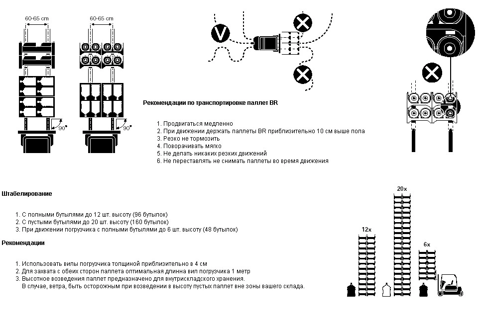 - При движении погрузчика с полными бутылями до 6 шт. высоту (48 бутылок)