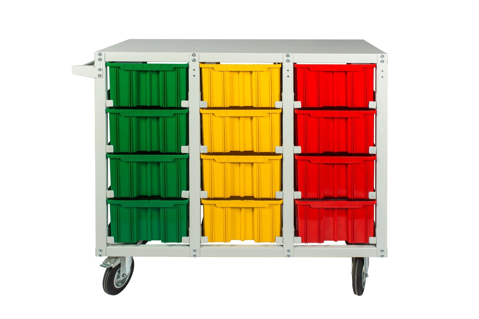 Стеллаж с направляющими мобильный односторонний V4-12 ячеек (160К), грузоподъемность до 300кг. Предназначен для размещения контейнеров V-4 в отдельных ячейках на продольных направляющих. Подходит для эксплуатации в автомастерских, в строительных магазинах, на складах, где необходимо складирование мелкоштучных изделий и инструментов. При использовании вместе с колесами и ручкой, данный стеллаж становится мобильным, что значительно расширяет его функциональные возможности для перемещения хранимых предметов по территории предприятия, склада, цеха. Конструкция ящиков модели V4 обеспечивает быстрый и легкий доступ. Ящики открытого типа позволяют быстро находить нужные позиции, это возможно благодаря хорошему визуальному обзору содержимого. Конструкция стеллажа позволяет одним движением руки извлекать нужный ящик для его наполнения или опустошения, и так же легко устанавливать его на место. Стеллаж поставляется в разобранном виде и состоит из:. металлического каркаса стеллажа с направляющими одностороннего V4-12 ячеек - 1 шт.; ящиков пластиковых модель V-4 - 12 шт.; комплекта колес резина, сталь диаметром 160мм.; ручки. Температурный режим эксплуатации от +20 до +70С.