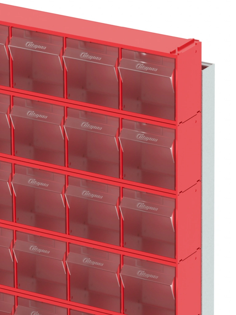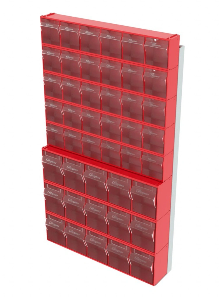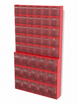 Стойка настенная Стелла-техник 402-00-05-03 (610х40х1000) представляет собой удобную систему хранения на основе откидных коробов, которая подойдет для использования в выставочных залах, магазинах, складах. Стойка крепится на стену при помощи саморезов или анкерных болтов (крепеж не входит в комплект и подбирается под уровень загруженности стойки). Комплектация: Рама FOX (610х40х1000) V402 - 1 шт.; Короб откидной Стелла-техник F-600-6 , 600х96х112мм, 6 ячеек, красный, прозрачный – 5 шт.; Короб откидной Стелла-техник F-600-5 , 600х140х168мм, 5 ячеек, красный, прозрачный – 3 шт.; Упаковка. Преимущества: Металлическое основание; Значительная устойчивость; Хорошая вместимость; Длительный срок службы.
