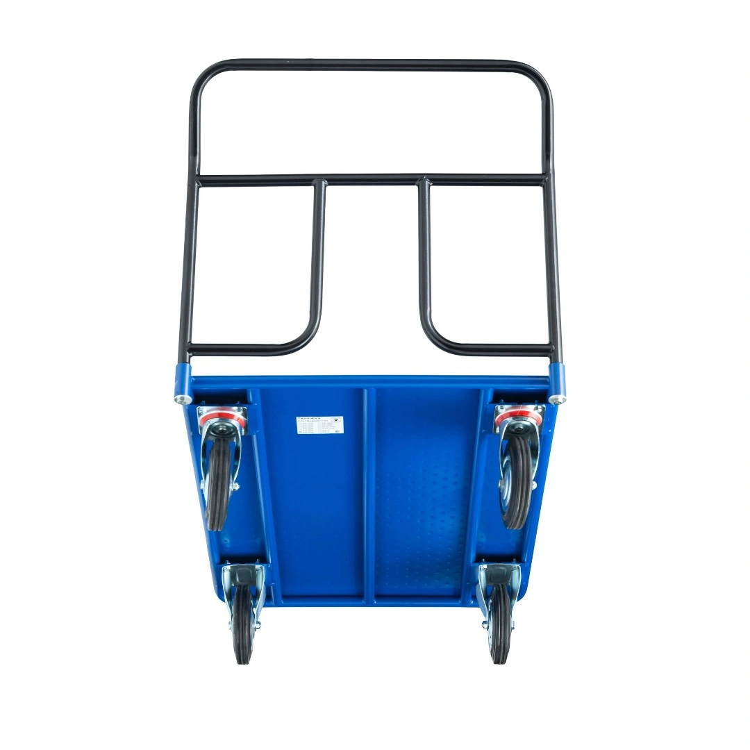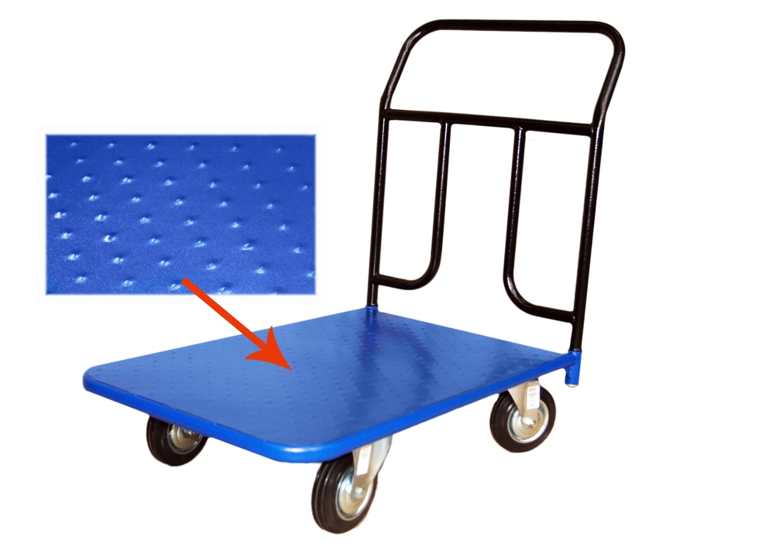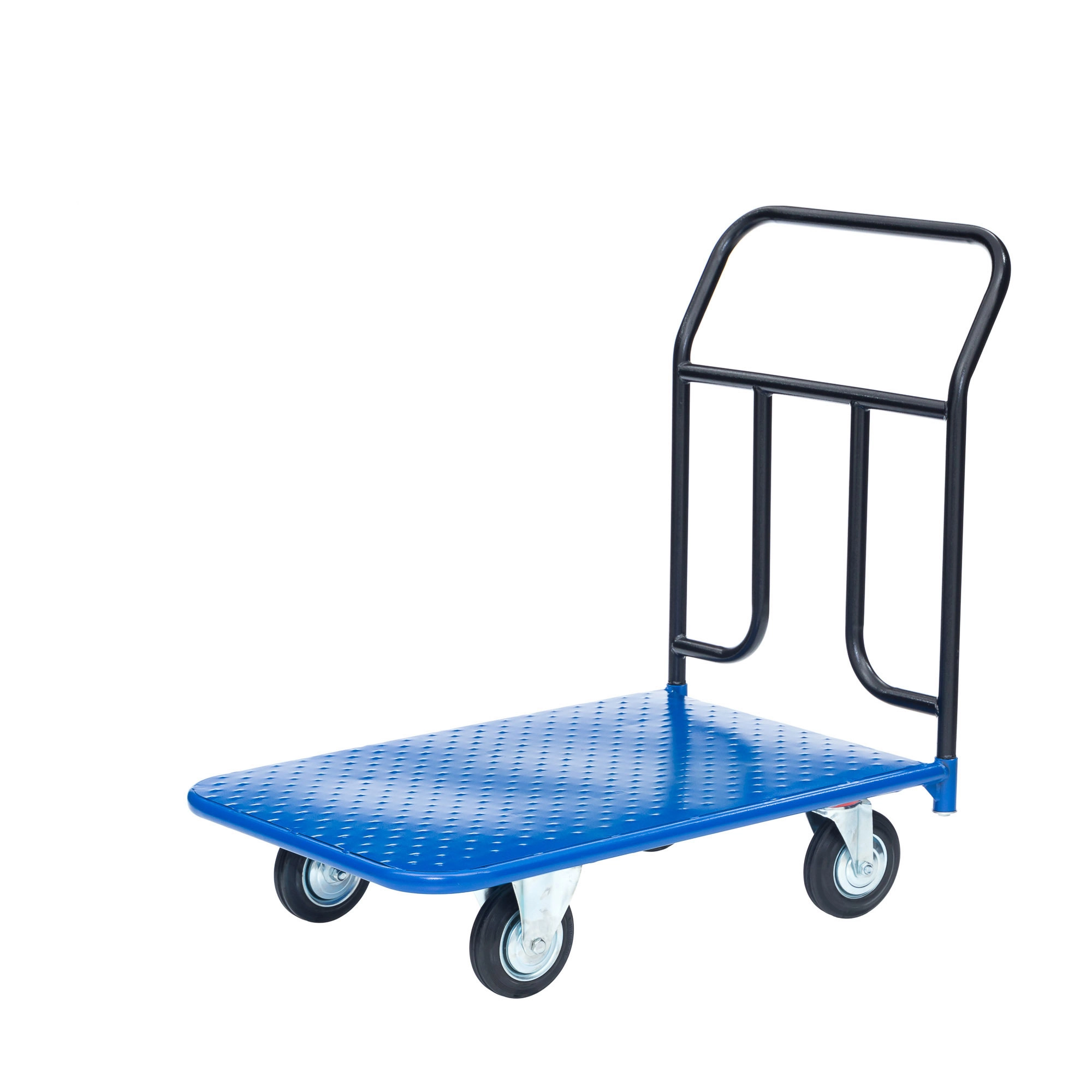Платформенная 4-х колесная тележка КП-350-125-И используется для перемещения различных грузов в складских помещениях. Ручка крепится к платформе болтами, для компактного хранения можно снять, высота ручки 750мм. Платформа имеет уникальную рельефную, полимерную, противоскользящую поверхность, размером 600х1200мм. Цвет - синий, шагрень. Тележка комплектуется: метизами для крепления, двумя поворотными и двумя неповоротными промышленными колесами, диаметром 125мм., из черной стандартной резины, от всемирно известного, ведущего итальянского производителя Tellure Rota. Грузоподъемность до 390кг.